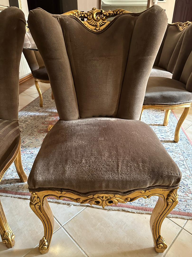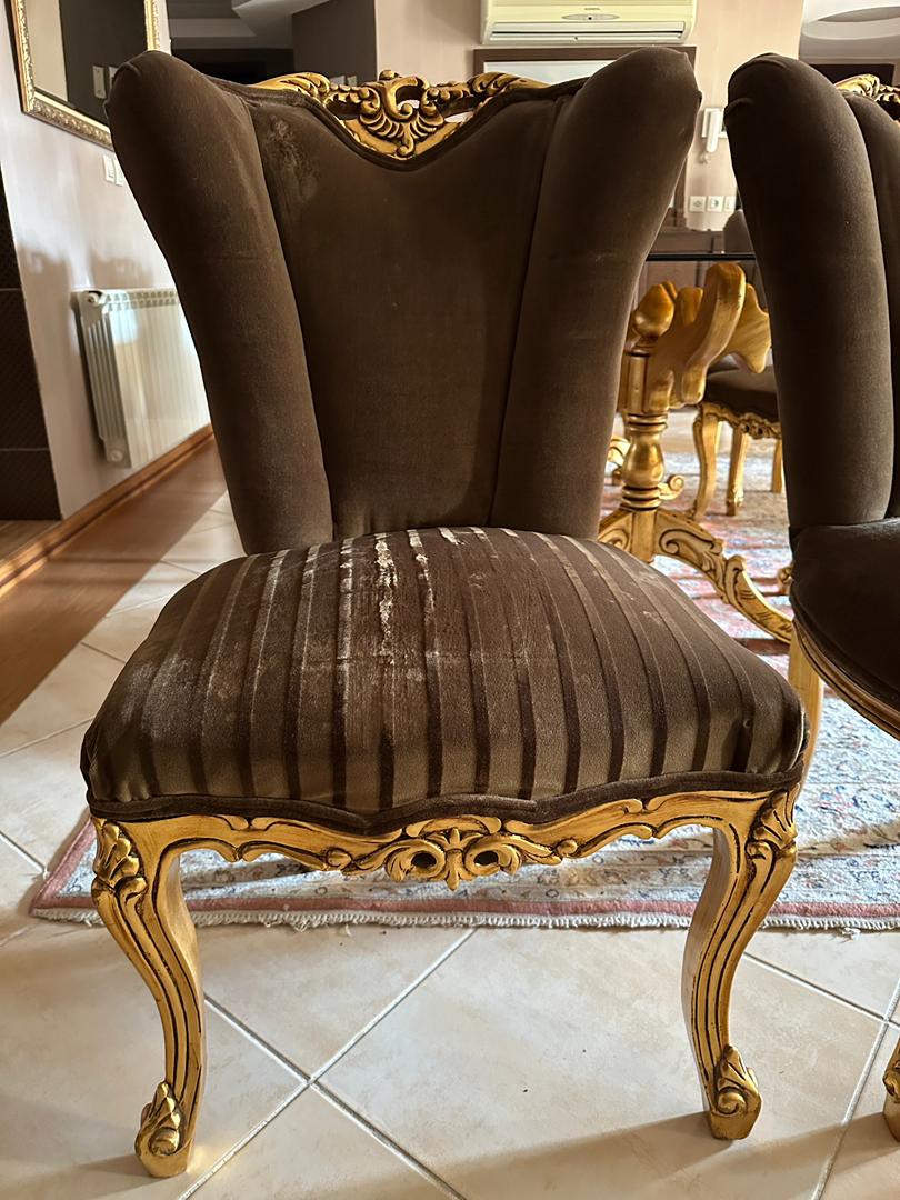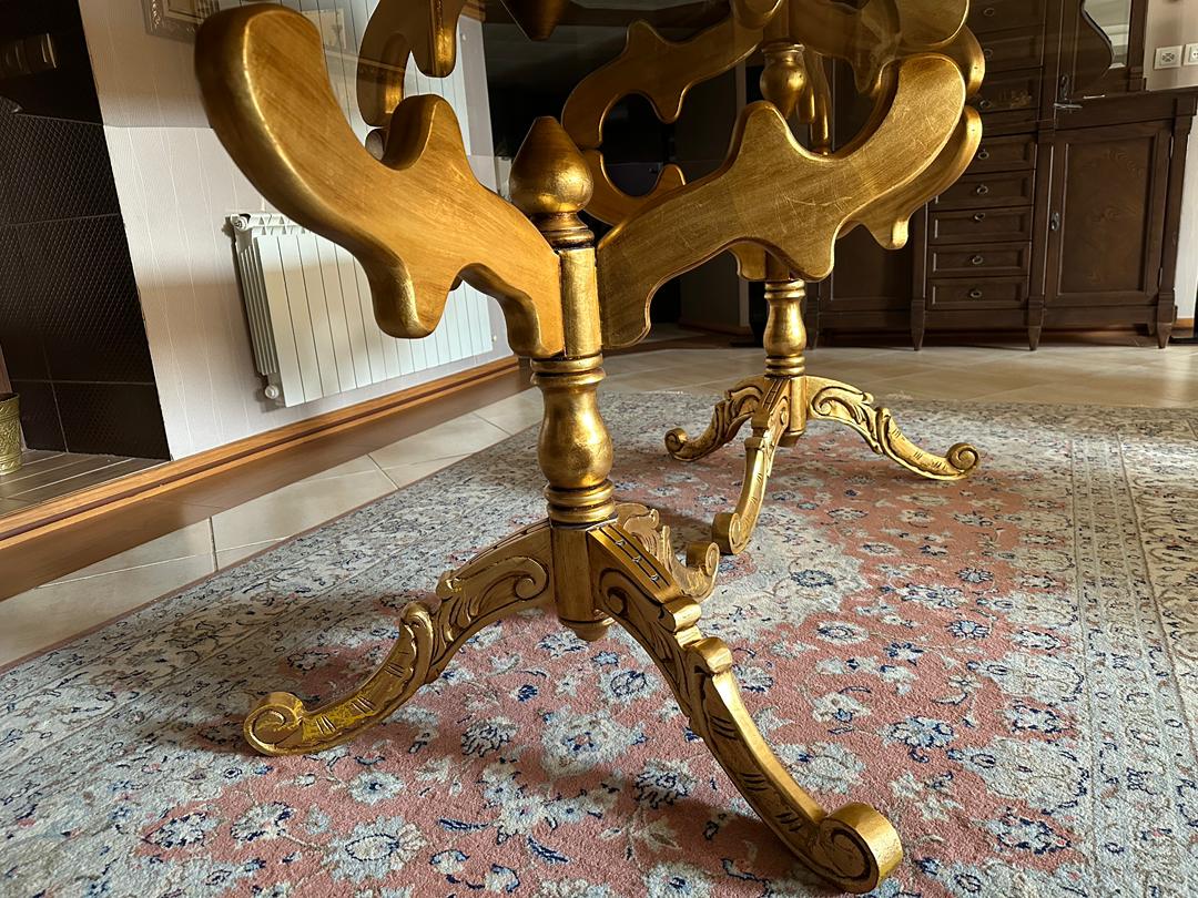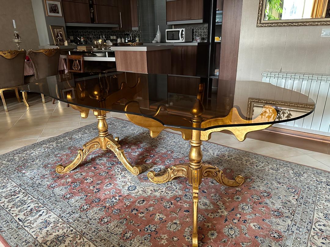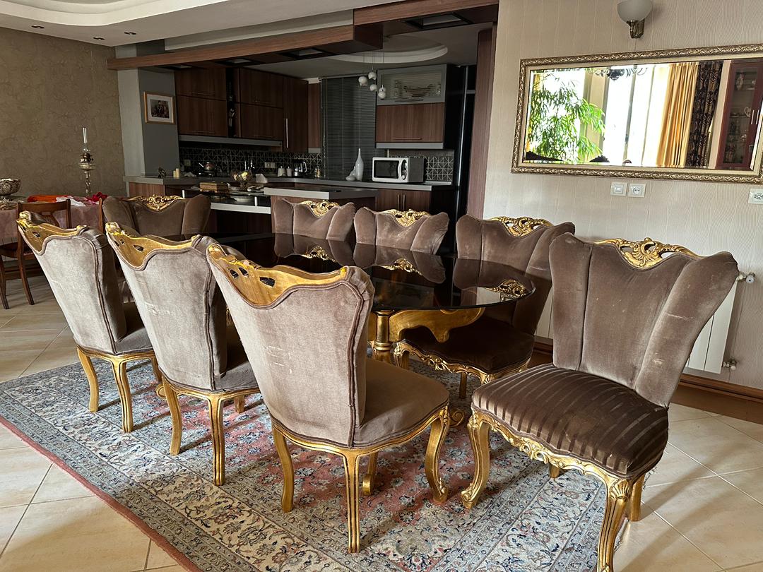میز ناهار خوری شامل دو عدد پایه ورق طلاکاری شده و یک شیشه به ابعاد ۲۲۰در ۱۱۰ سانت به همراه ۸ عدد صندلی ناهار که به صورت اشانتیون داده میشود
